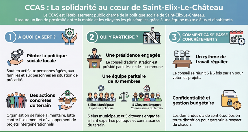Le Centre Communal d’Action Sociale (CCAS) est l'outil de proximité de la commune de Saint-Elix-le-Château pour mettre en œuvre sa politique de solidarité. Établissement public à part entière, il a pour mission d'accompagner et de soutenir les personnes les plus fragiles, qu'il s'agisse de nos aînés, des familles ou des personnes traversant des difficultés passagères.